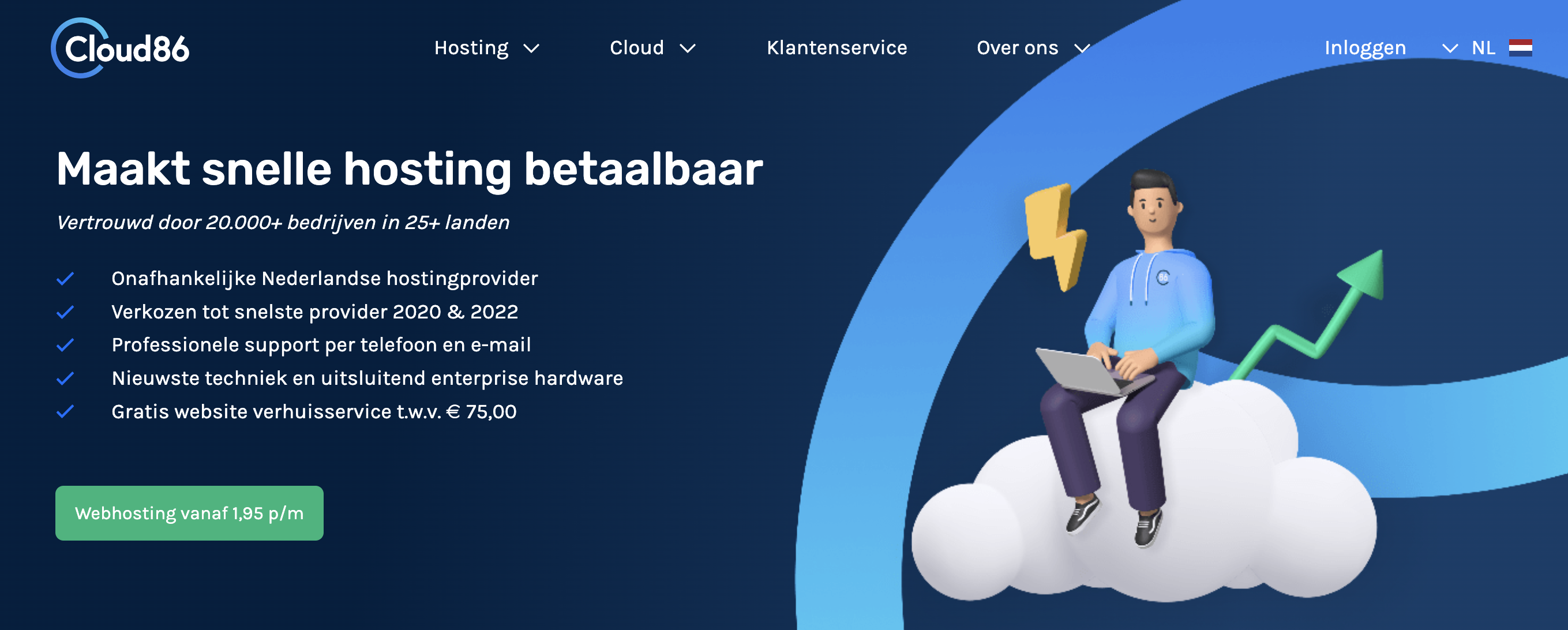 Cloud86 is een Nederlands webhosting bedrijf. Ze zijn vrij jong, maar erg populair. Dit komt onder andere omdat ze één van de snelste webhosting bedrijven zijn in Nederland, blijkt uit cijfers van 2020 en 2022. Een andere reden dat zij goed in de smaak vallen op de Nederlandse markt is dat zij eerlijke, goedkope prijzen hebben bij hun pakketten.